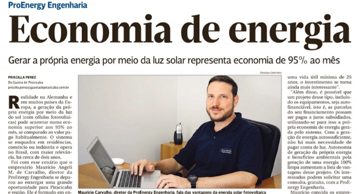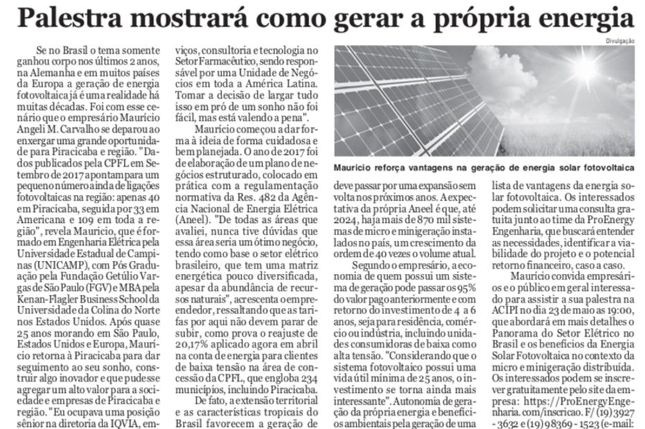 O Eng. Maurício Angeli Maranhão de Carvalho, sócio fundador da ProEnergy Engenharia, concedeu uma entrevista ao vivo em 07/08/18 para o Jornal da Manhã da Radio Educativa FM de Piracicaba, onde explica as possibilidades de projeto e os benefícios da utilização da energia solar fotovoltaica.